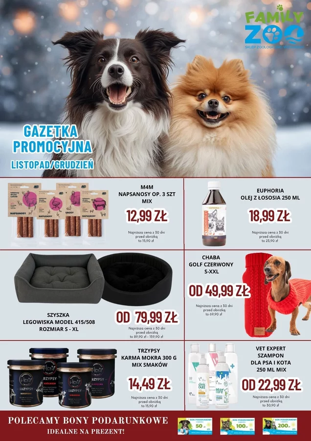 Jesień i zima w Family Zoo to czas wyjątkowych promocji dla Twoich pupili! Nasza najnowsza gazetka na listopad i grudzień pełna jest atrakcyjnych ofert na karmy, przysmaki, akcesoria i zabawki dla zwierząt - od psów i kotów, po gryzonie, ptaki i rybki.
